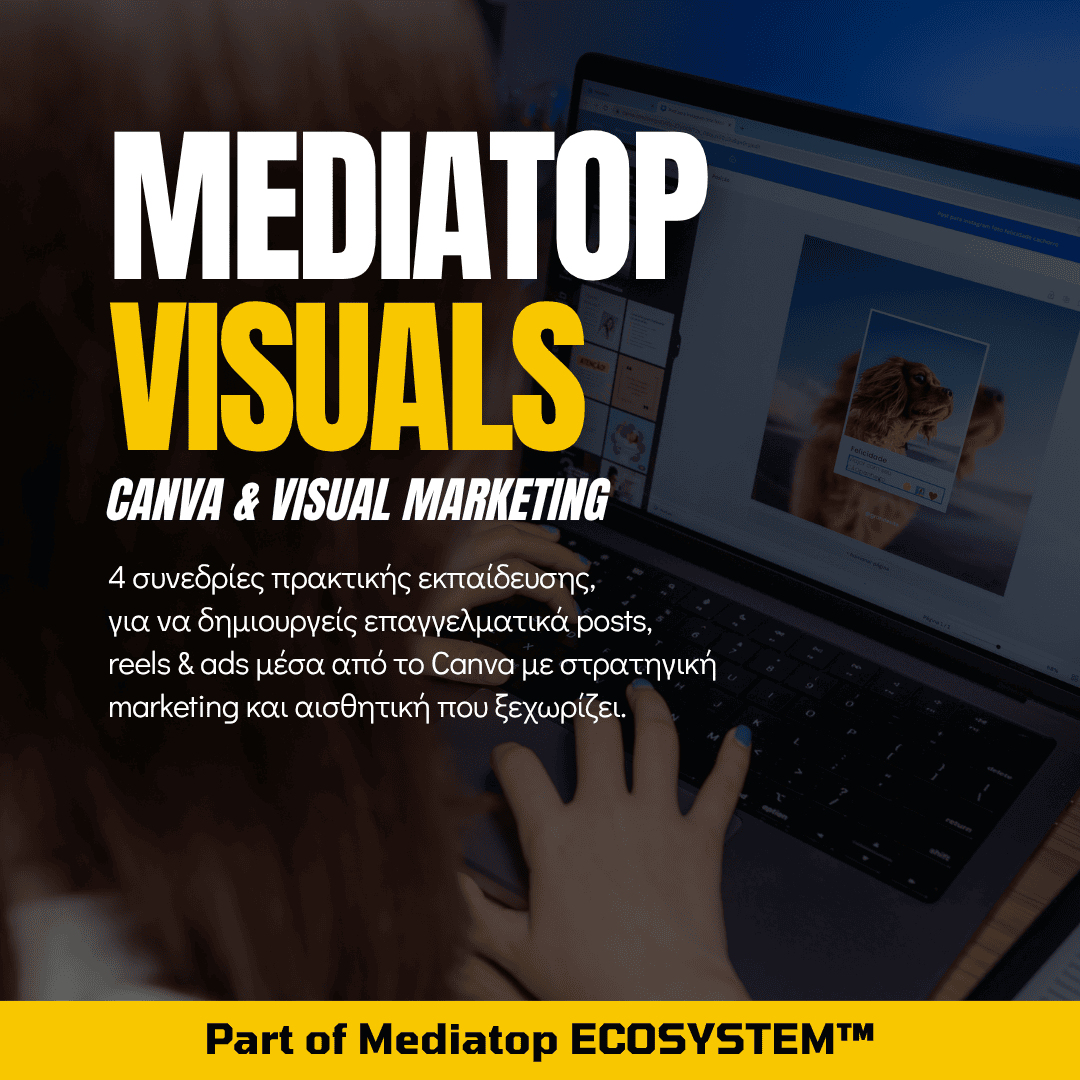 Το Mediatop Visuals™ είναι το πρακτικό πρόγραμμα που σε μαθαίνει να δημιουργείς επαγγελματικά posts, reels και ads μέσα από το Canva με marketing προσέγγιση, όχι απλώς “όμορφα σχέδια”. Μαθαίνεις να μετατρέπεις τις ιδέες σου σε περιεχόμενο που τραβάει την προσοχή, επικοινωνεί ξεκάθαρα το μήνυμά σου και οδηγεί σε πωλήσεις.